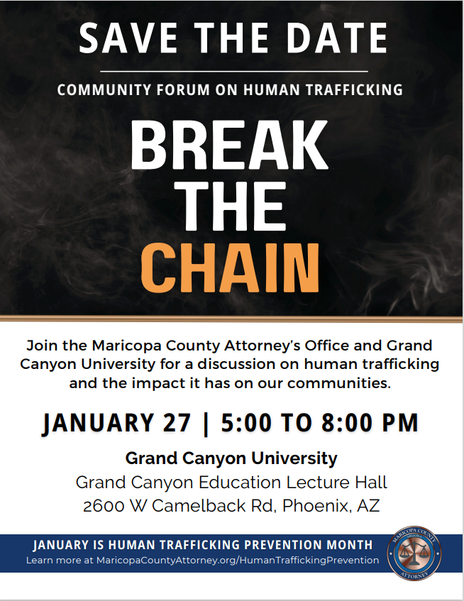 Please join the Maricopa County Attorney’s Office and Grand Canyon University for a discussion on human trafficking and the impact it has on our communities.